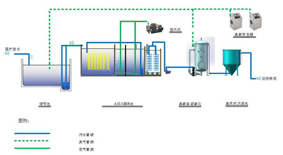 3、電絮凝-催化臭氧化高級(jí)氧化反應(yīng)器本工藝核心技術(shù)為電絮凝-催化臭氧化高級(jí)氧化反應(yīng)器,該處理技術(shù)和反應(yīng)器裝置均具有自主知識(shí)產(chǎn)權(quán)。經(jīng)過(guò)A/O-MBR反應(yīng)池的污水進(jìn)入電絮凝-催化臭氧高級(jí)氧化反應(yīng)器進(jìn)行深度強(qiáng)化處理,電絮凝-催化臭氧高級(jí)氧化反應(yīng)器采用了電絮凝和催化臭氧化結(jié)合,電絮凝產(chǎn)生的活性物質(zhì)能夠催化臭氧產(chǎn)生具有強(qiáng)氧化性的自由基,并且由于電解的強(qiáng)化作用,該反應(yīng)器內(nèi)可同時(shí)發(fā)生催化臭氧反應(yīng)、類(lèi)芬頓反應(yīng)、過(guò)臭氧化反應(yīng)、直接臭氧分子反應(yīng)和電絮凝等反應(yīng),能夠極大地提高自由基的產(chǎn)生速率和產(chǎn)生量,提高污水中有機(jī)污染物的處理效率和病原微生物的消殺效果。同時(shí),外加雙氧水能夠強(qiáng)化有雙氧水參與的類(lèi)芬頓反應(yīng)和過(guò)臭氧化反應(yīng),能進(jìn)一步增加自由基的產(chǎn)生速率和產(chǎn)生量,強(qiáng)化污水中有機(jī)污染物的處理效率和病原微生物的消殺效果,實(shí)現(xiàn)醫(yī)院污水同步消毒降解。廉價(jià)電極板能夠降低設(shè)備和污水處理成本。還可通過(guò)在反應(yīng)器中添加硅酸鈉等緩蝕劑,緩蝕劑的加入能夠極大地降低電絮凝沉淀的產(chǎn)生,并且保持污水處理和病原微生物消殺效果。