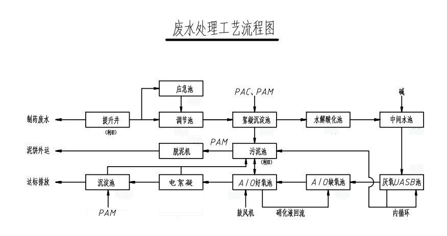 制藥廢水首先經(jīng)過(guò)車間輸送管道進(jìn)入提升井,再通過(guò)提升泵使廢水進(jìn)入調(diào)節(jié)池調(diào)節(jié)水質(zhì)及水量;經(jīng)充分混合后廢水提升進(jìn)入混凝反應(yīng)沉淀池,去除SS及有機(jī)色素后進(jìn)入水解酸化池,通過(guò)水解酸化菌的作用后再進(jìn)入?yún)捬鮑ASB系統(tǒng),廢水在厭氧菌的作用下將難降解的物質(zhì)降解為易降解的物質(zhì),將廢水中的大分子物質(zhì)分解為小分子的物質(zhì),最終分解為CH4和H2O,此后進(jìn)入A/O處理系統(tǒng)(,經(jīng)過(guò)生物好氧菌的作用下進(jìn)行生物降解除去BOD,同時(shí)脫氮除磷再進(jìn)入電催化氧化裝置進(jìn)行深度處理,最后經(jīng)過(guò)沉淀池沉淀后達(dá)標(biāo)排放。污泥經(jīng)濃縮后用疊螺機(jī)壓濾后外運(yùn)處理。