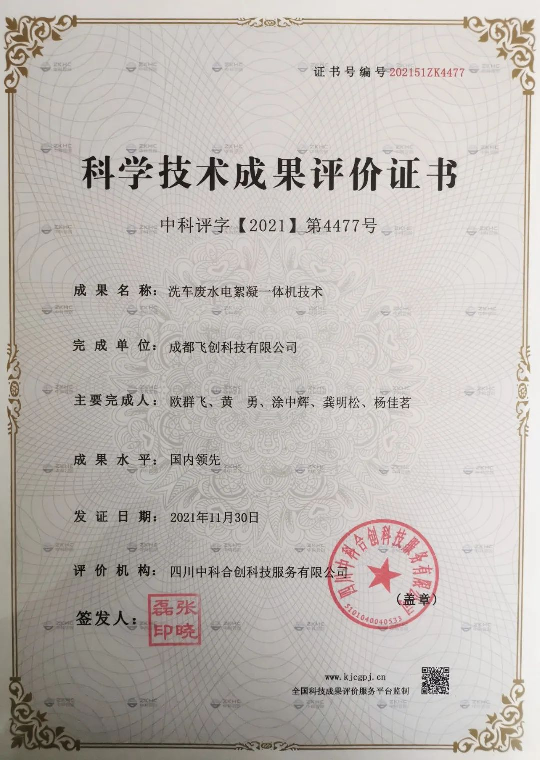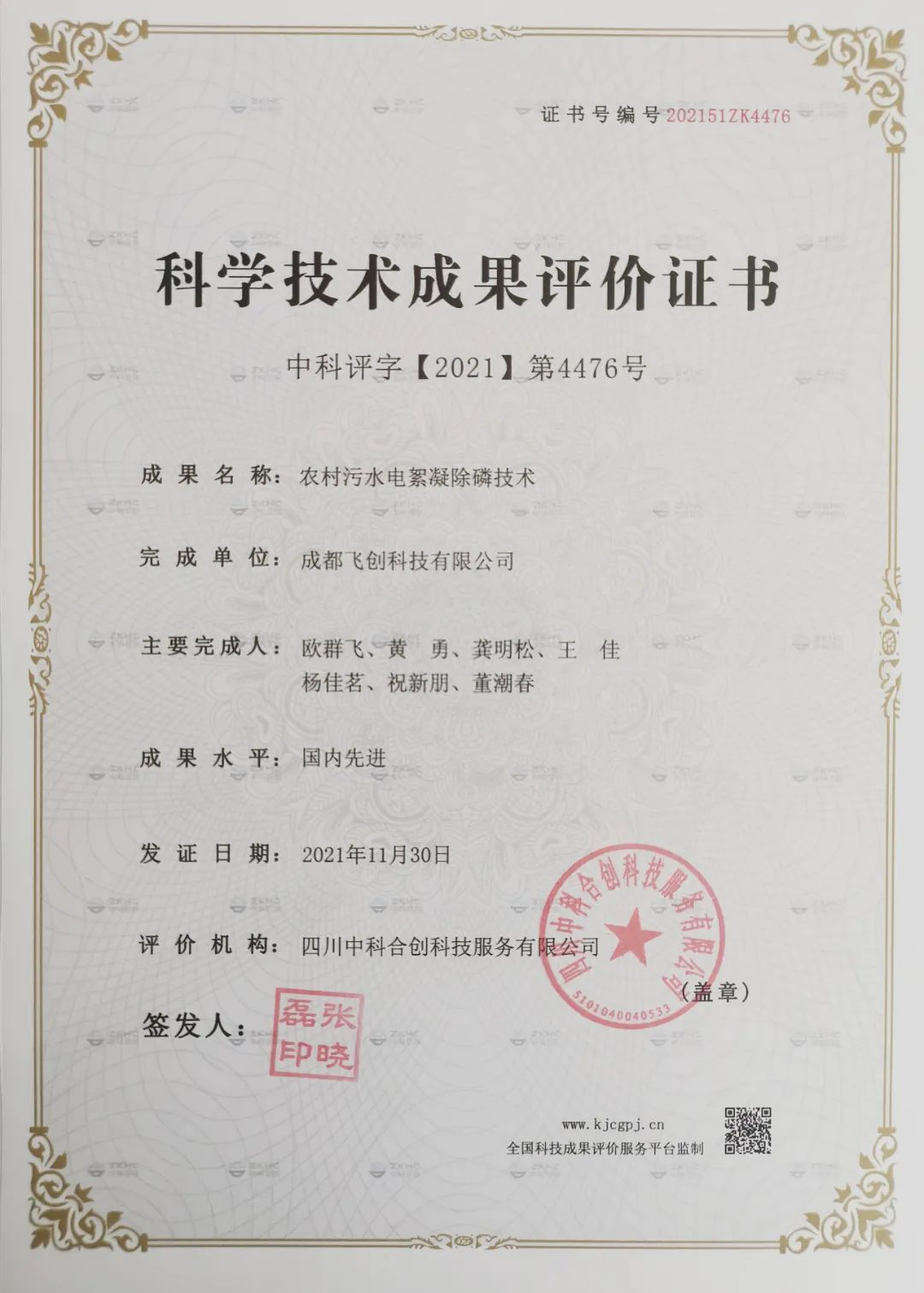 祝賀飛創(chuàng)科技“農(nóng)村污水電絮凝除磷技術(shù)”藝獲得“國內(nèi)先進”水平