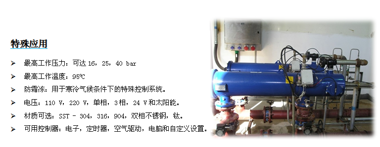 具有時(shí)間清洗功能(由運(yùn)營(yíng)商預(yù)設(shè)),確保在壓力損失沒(méi)有達(dá)到預(yù)設(shè)值的情況下,沖洗自動(dòng)的進(jìn)行。