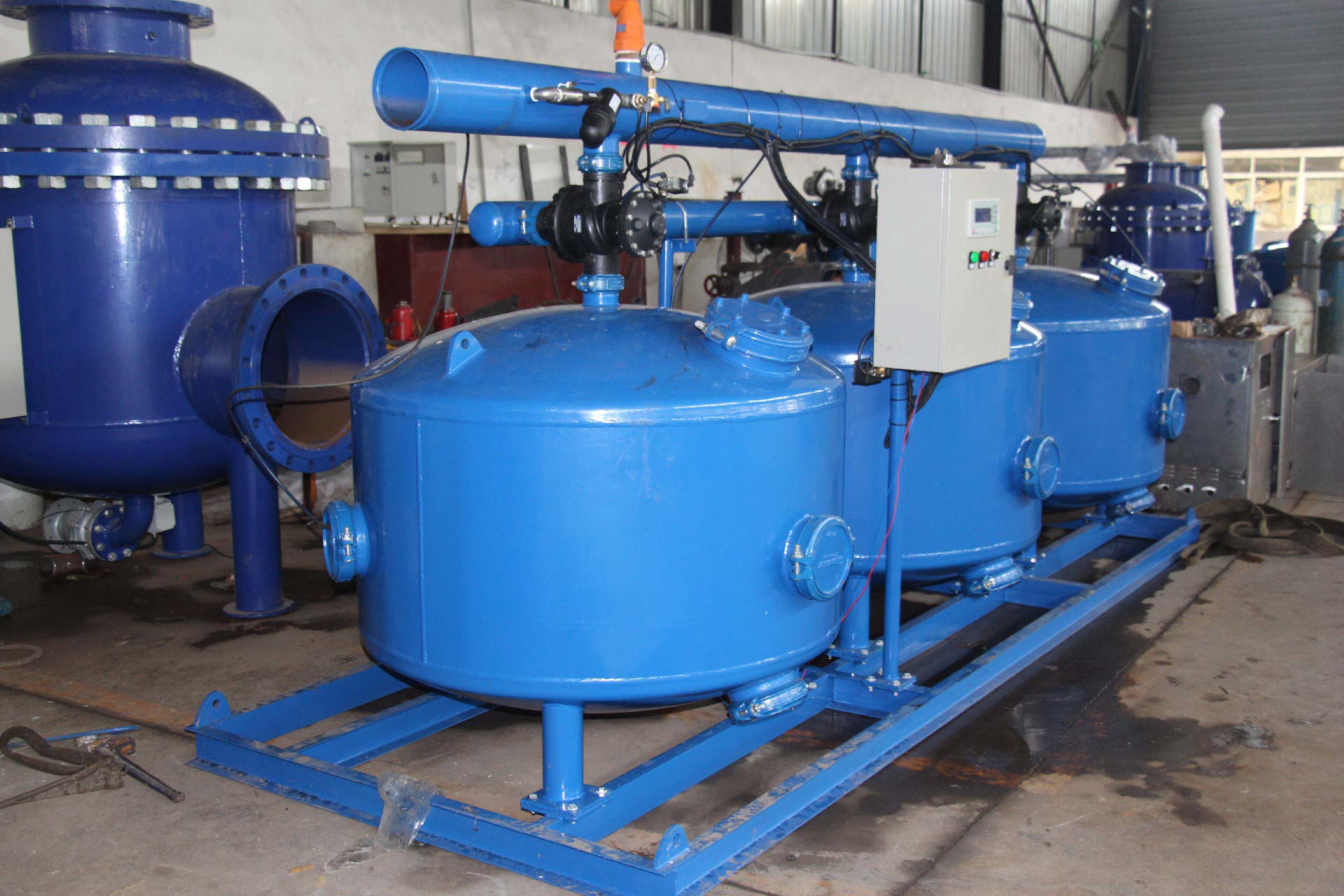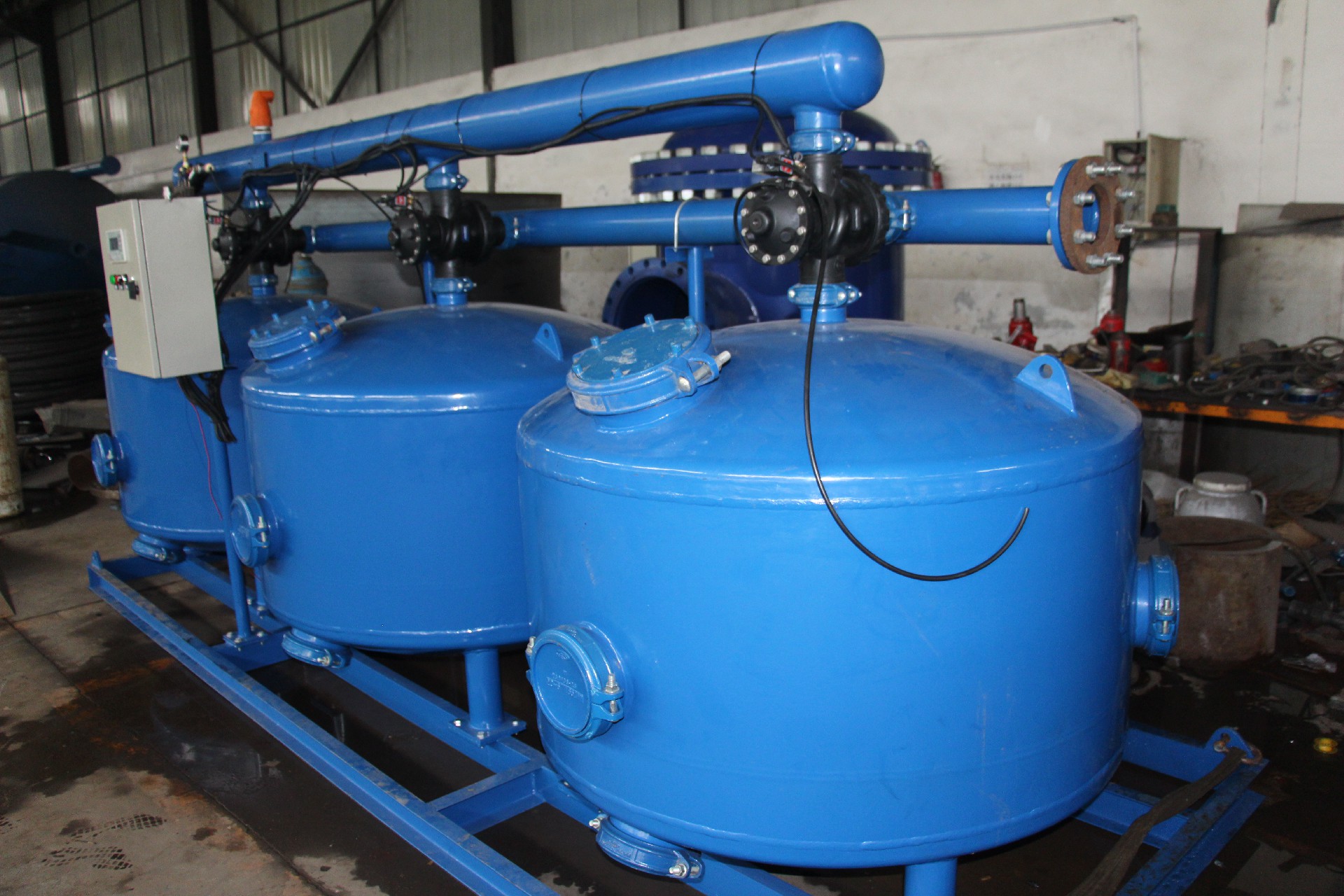 隨著雜質(zhì)在填料層中的不斷聚積,水頭損失將不斷增大。當水頭損失到達一定的設定限度時,或者經(jīng)過一個預先設定好的時間段后,系統(tǒng)將自動轉(zhuǎn)換至反洗狀態(tài),以清洗聚積起來的雜質(zhì)。對系統(tǒng)來說,經(jīng)常性的反洗以清除聚積起來的雜質(zhì)是必須的。當系統(tǒng)處于反洗狀態(tài)時,某個過濾器會將干凈的、經(jīng)過過濾的水通過一個三通反洗閥同時逆流入這個過濾器中。在這個逆流過程中,被反洗的過濾單元的填料層在水流的沖擊下被沖起,雜質(zhì)則通過一個三通的反洗口被排出。在過濾系統(tǒng)中,特殊設計的集水器使填料層在反洗狀態(tài)時形成內(nèi)環(huán)流,填料之間互相搓洗,大限度地提高反沖洗效率,減少所需的反洗水,同時反洗時不跑砂。當反洗結(jié)束時,閥門又回復到過濾狀態(tài),下一個過濾器則準備進入反洗狀態(tài)。